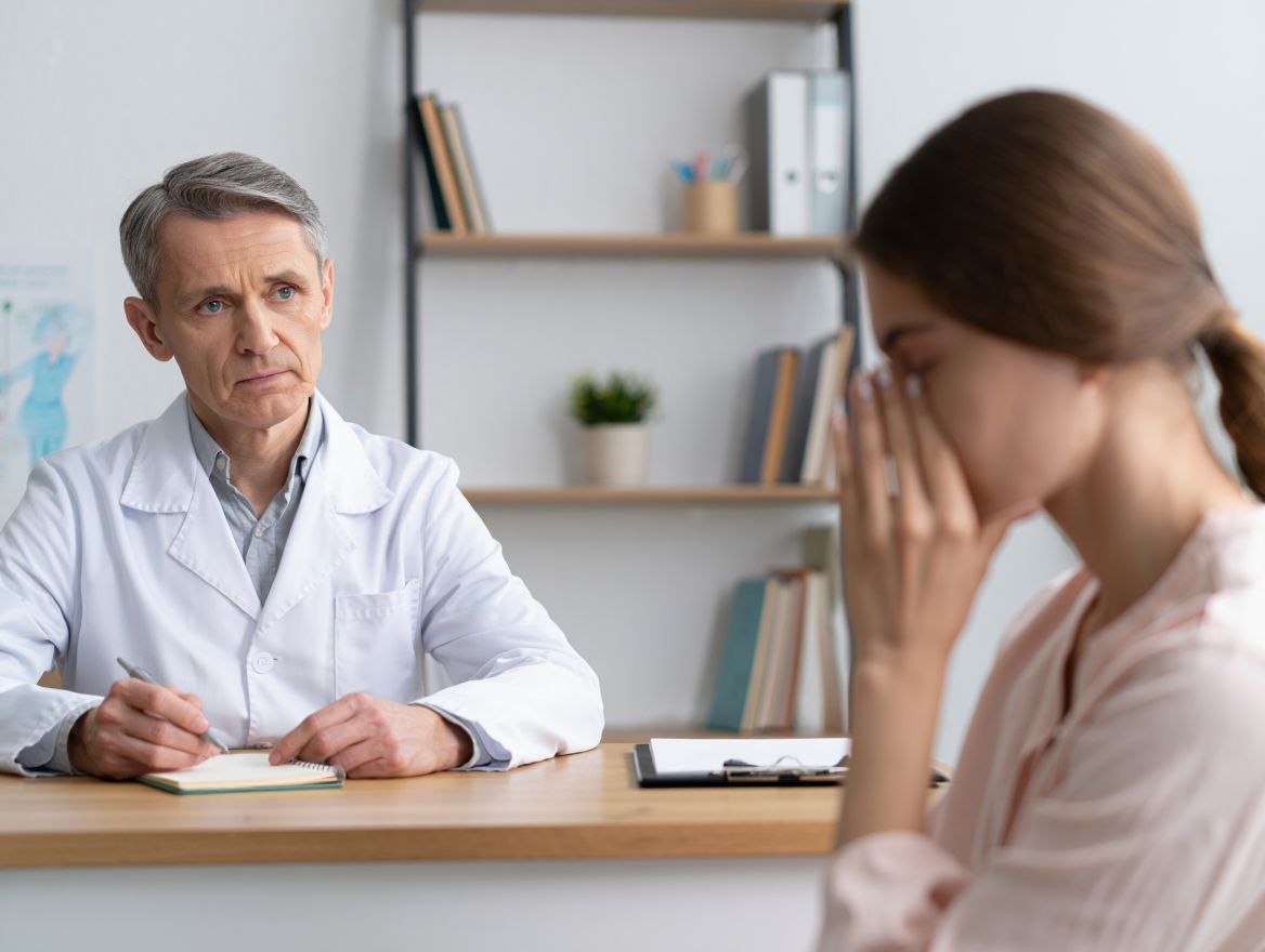 Женщина в подавленном состоянии на консультации психотерапевта